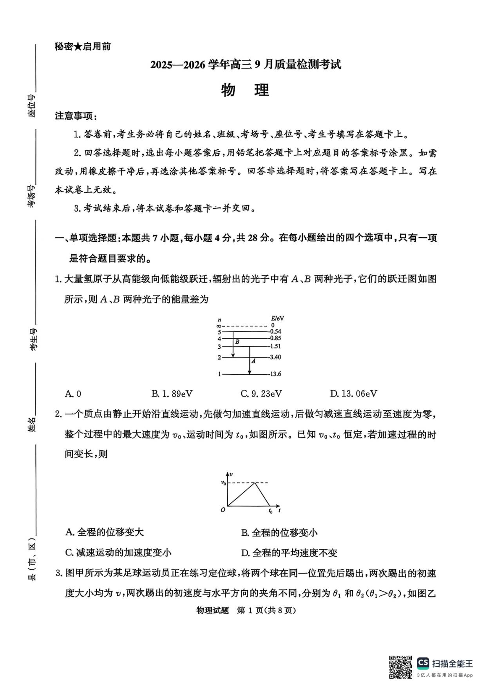 河南省青桐鸣2025-2026学年高三上学期9月质量检测考试 物理.pdf