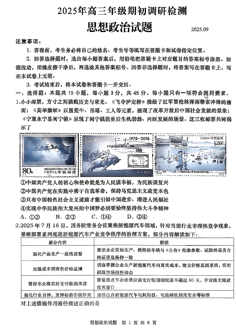 山东省青岛市2025年高三年级期初调研检测 政治.pdf