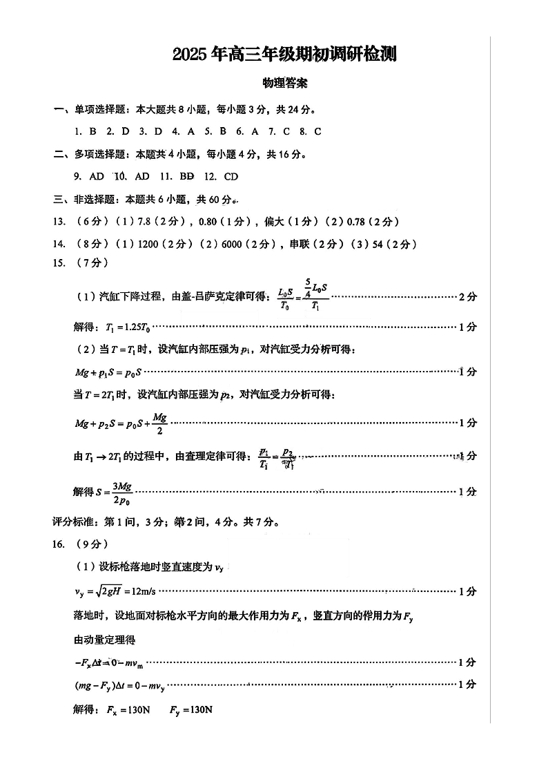 山东省青岛市2025年高三年级期初调研检测 物理答案.pdf