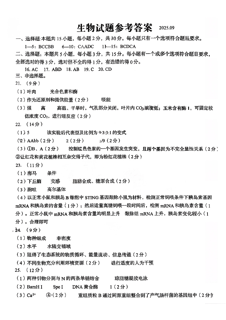 山东省青岛市2025年高三年级期初调研检测 生物答案.pdf