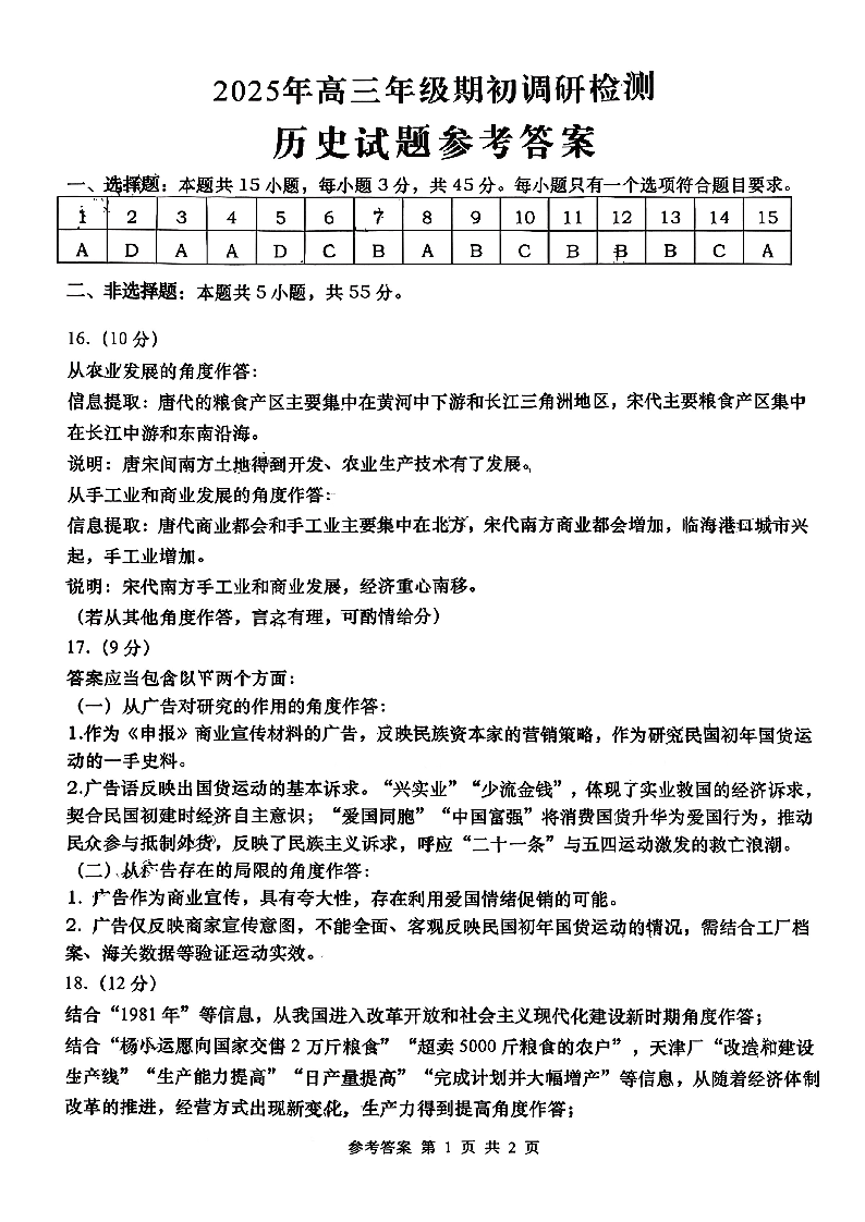 山东省青岛市2025年高三年级期初调研检测 历史答案.pdf