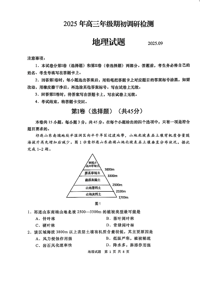 山东省青岛市2025年高三年级期初调研检测 地理.pdf