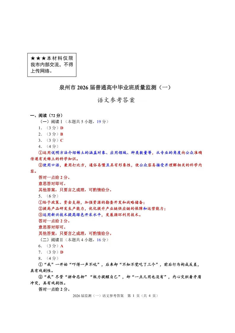 福建省泉州市2026届高中毕业班质量检测(一)语文答案.pdf
