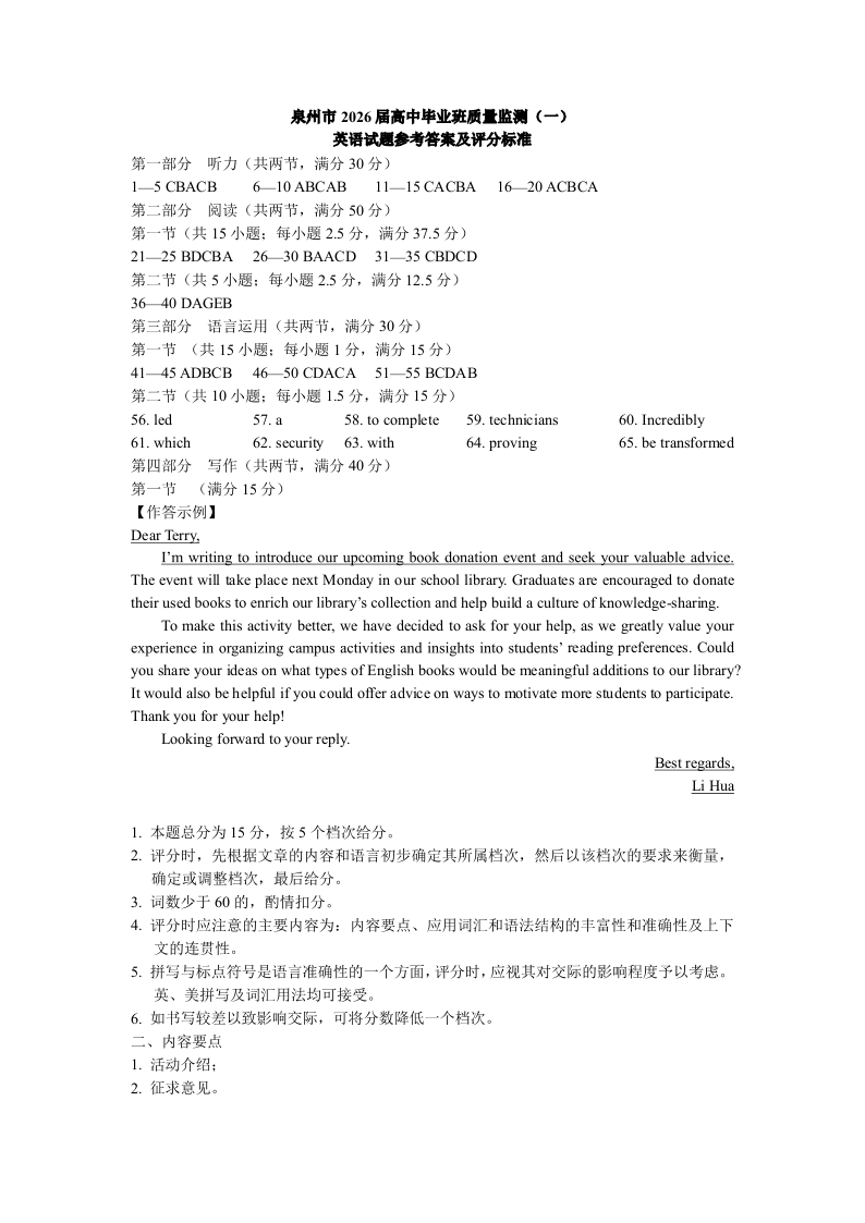 福建省泉州市2026届高中毕业班质量检测(一)英语答案.pdf