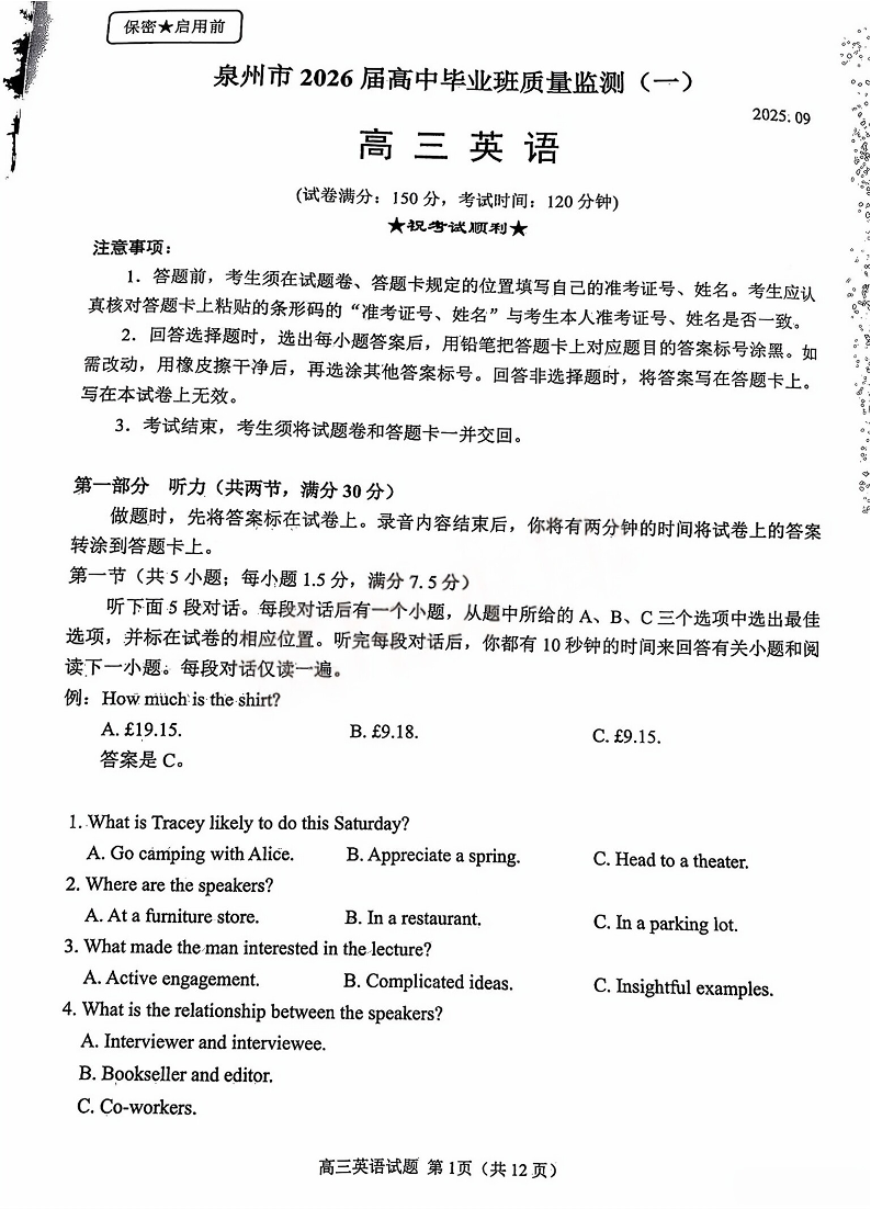 福建省泉州市2026届高中毕业班质量检测(一)英语 .pdf