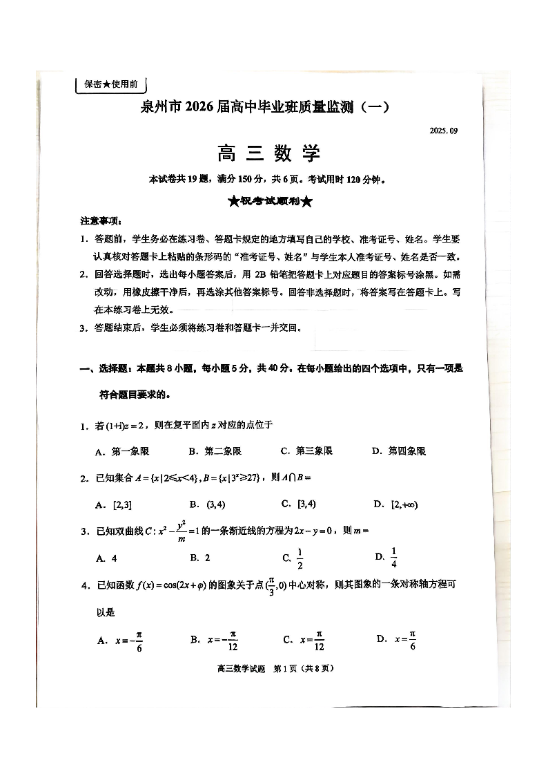 福建省泉州市2026届高中毕业班质量检测(一)数学.pdf