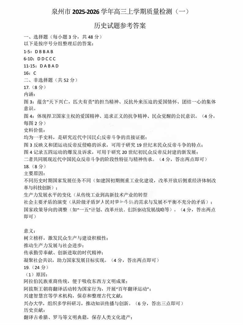 福建省泉州市2026届高中毕业班质量检测(一)历史答案.pdf