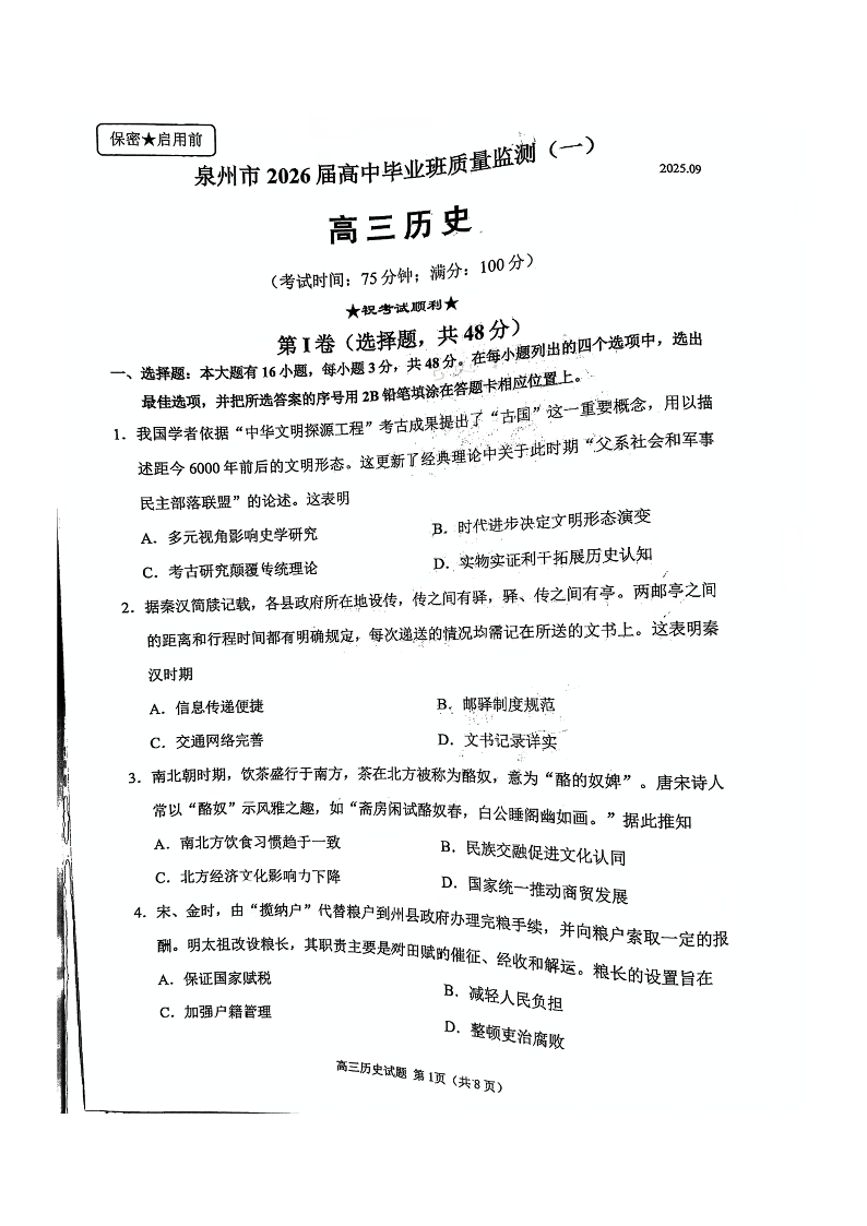 福建省泉州市2026届高中毕业班质量检测(一)历史.pdf