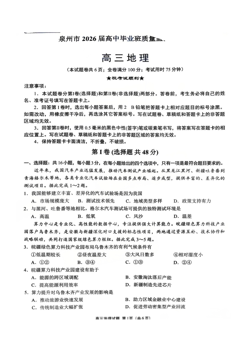 福建省泉州市2026届高中毕业班质量检测(一)地理.pdf
