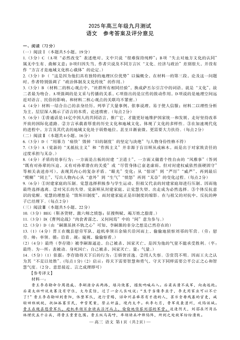 江西省南昌市2025年高三年级九月测试 语文答案.pdf