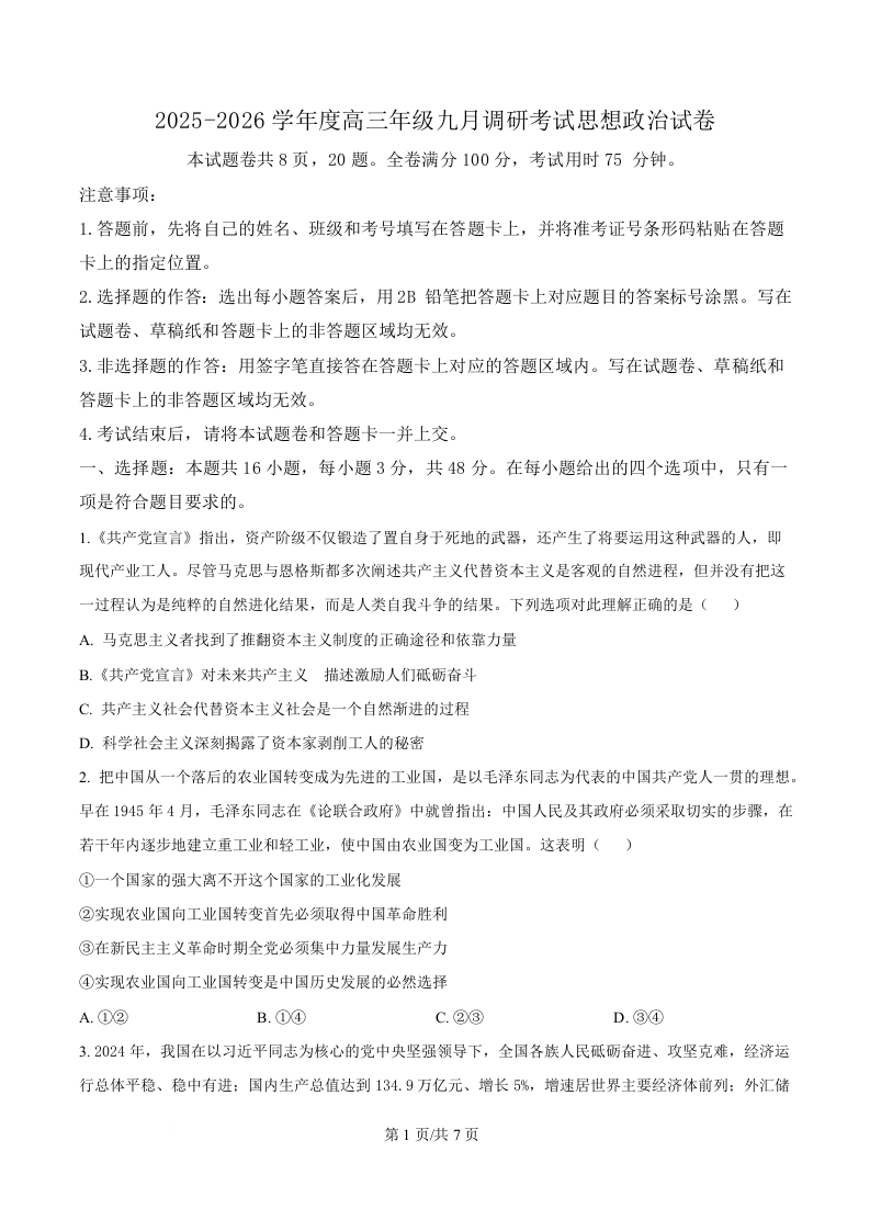 河北省保定市四校联考2026届高三上学期9月月考 政治.docx
