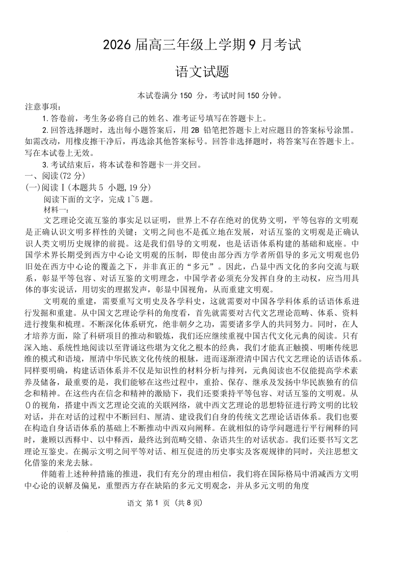 河北省保定市四校联考2026届高三上学期9月月考 语文试卷(含答案).docx