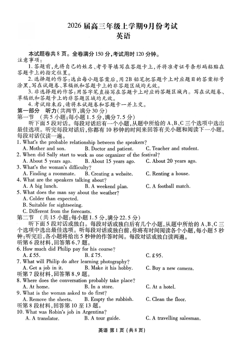 河北省保定市四校联考2026届高三上学期9月月考 英语试卷(含答案).pdf