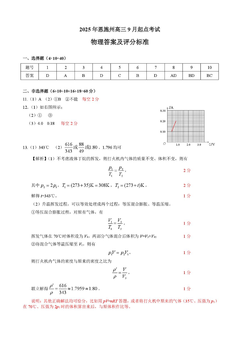 湖北省恩施2026届高三上学期9月起点考试 物理答案.pdf