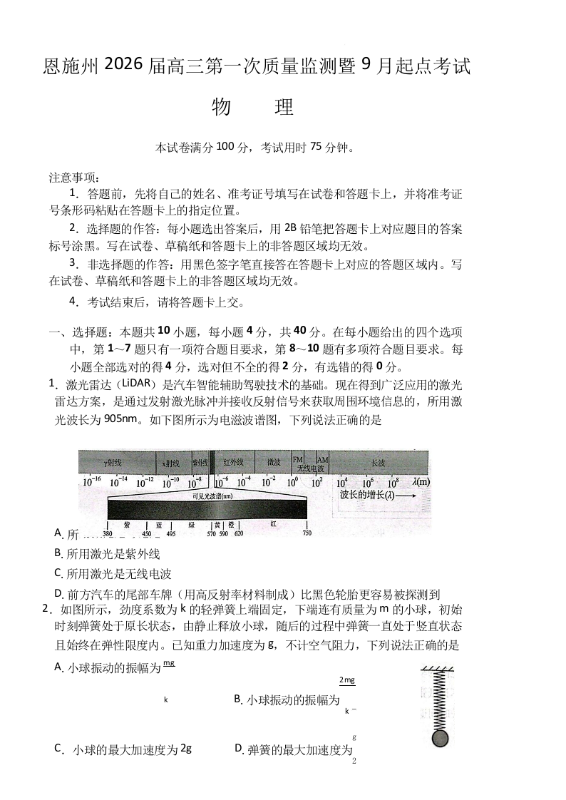 湖北省恩施2026届高三上学期9月起点考试 物理.docx