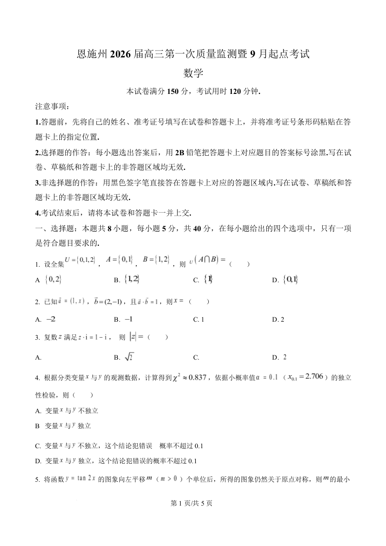 湖北省恩施2026届高三上学期9月起点考试 数学.docx