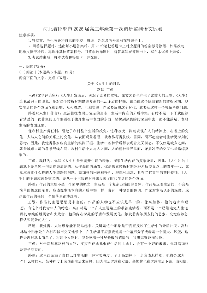 河北省邯郸市2026届高三年级第一次调研监测 语文试卷(含答案).docx