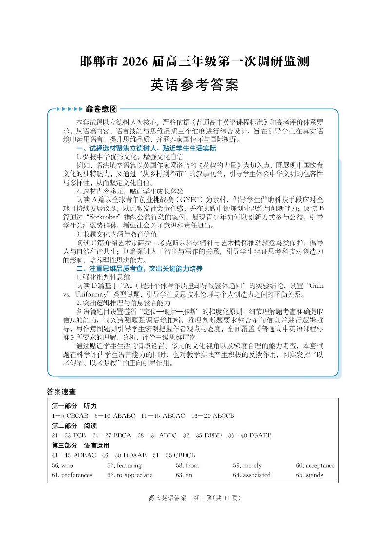 河北省邯郸市2026届高三年级第一次调研监测 英语答案.pdf