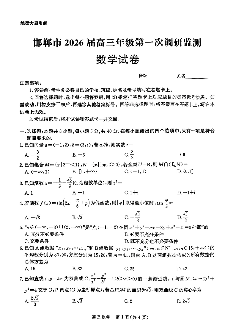 河北省邯郸市2026届高三年级第一次调研监测 数学.pdf