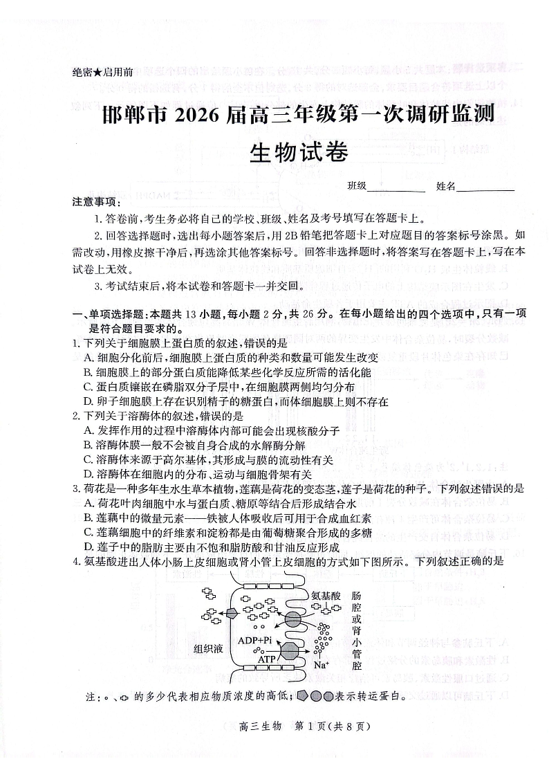 河北省邯郸市2026届高三年级第一次调研监测 生物.pdf