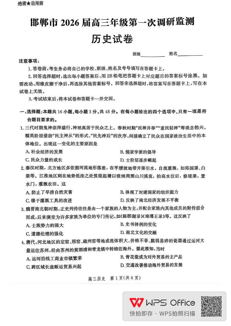 河北省邯郸市2026届高三年级第一次调研监测 历史.pdf