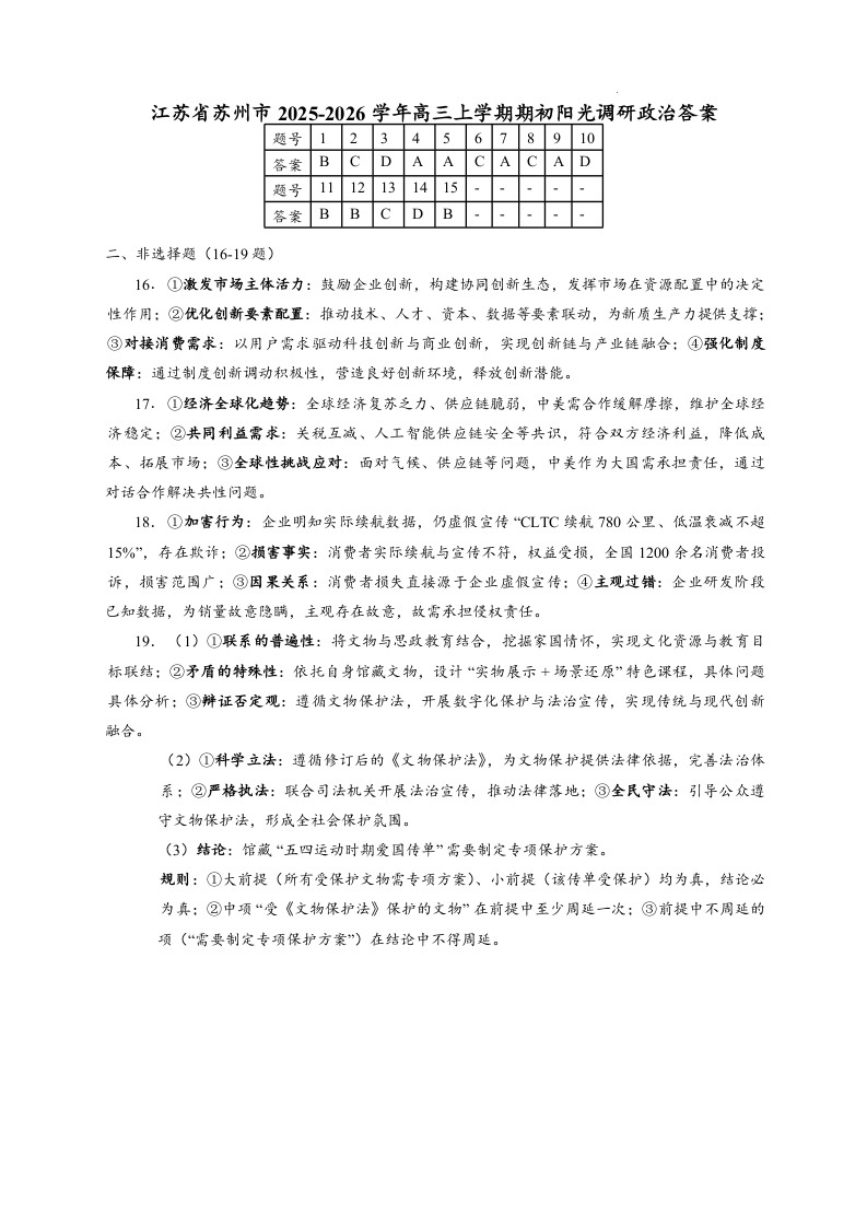 苏州市2026届高三年级期初阳光调研试卷 政治答案.docx