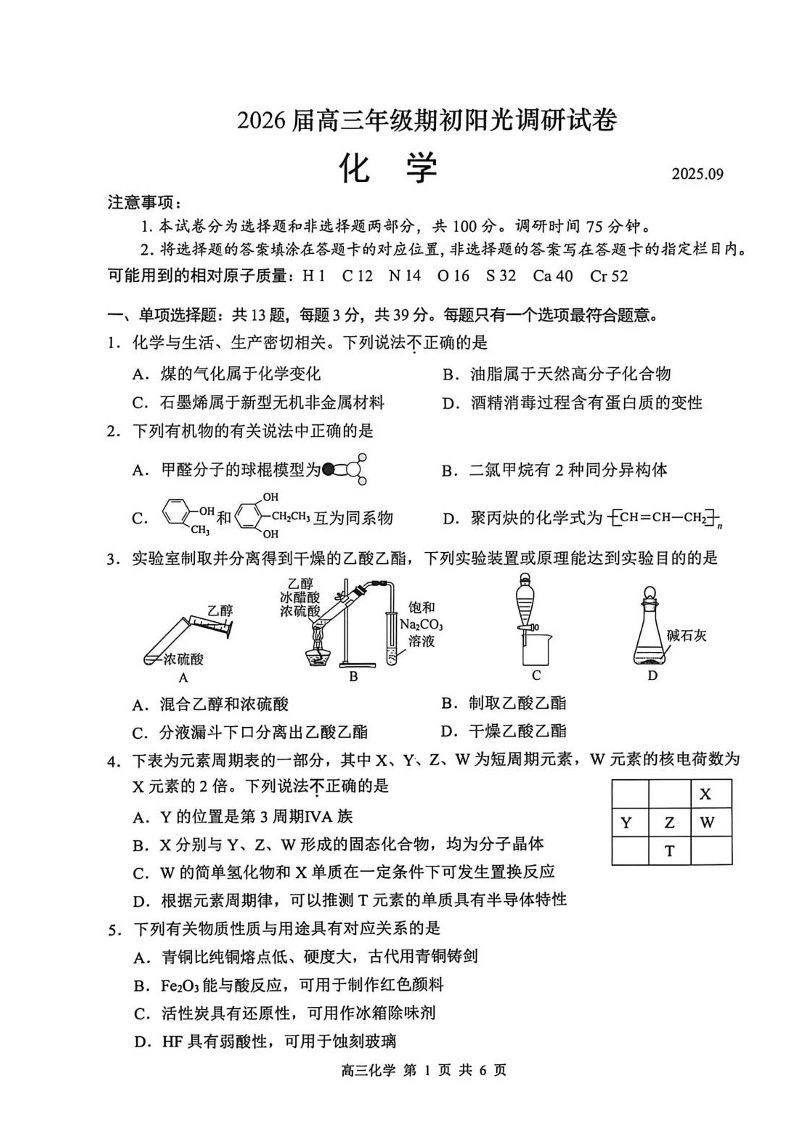 苏州市2026届高三年级期初阳光调研试卷 化学.pdf