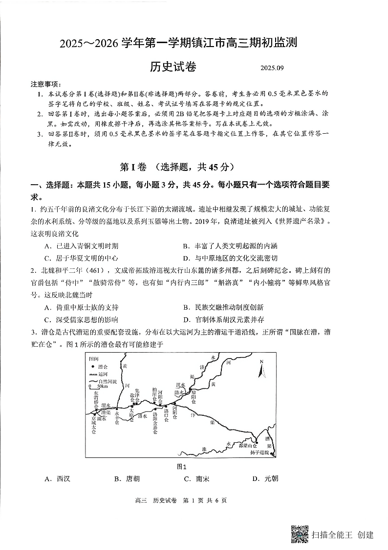 江苏省镇江市2025~2026学年第一学期高三期初监测 历史试卷(含答案).pdf