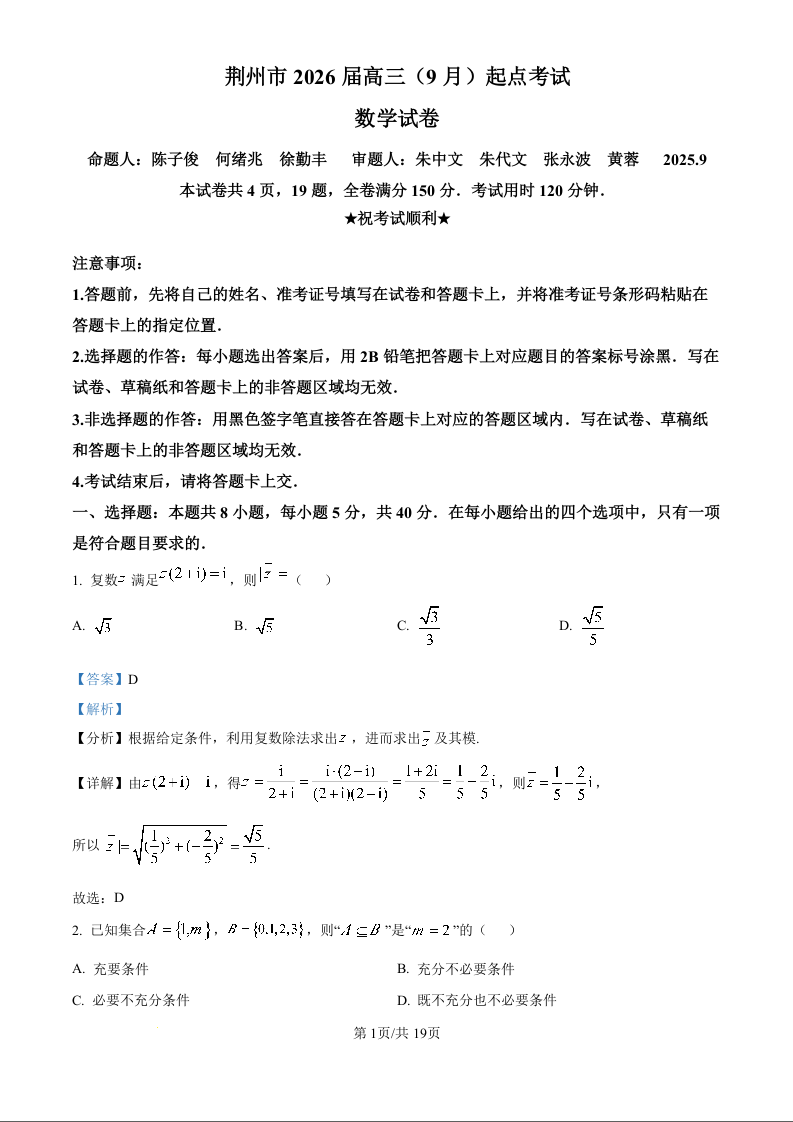 荆州市2026届高三(9月)起点考试 数学答案.docx