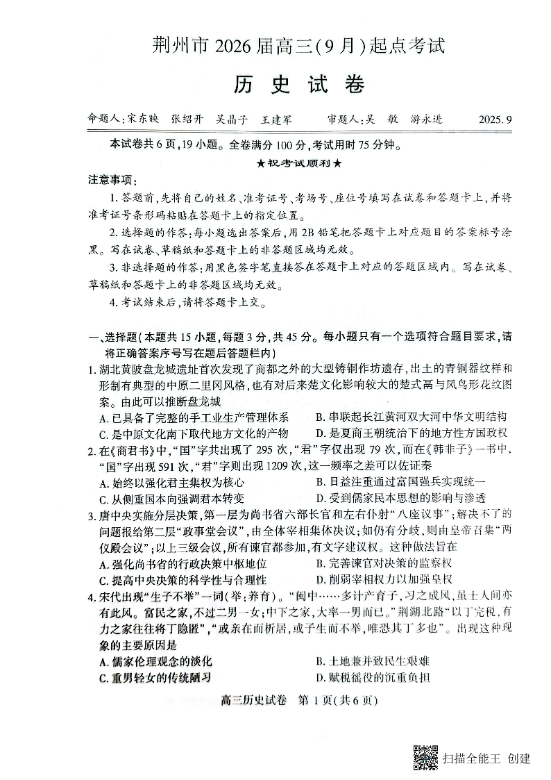 荆州市2026届高三(9月)起点考试 历史.pdf