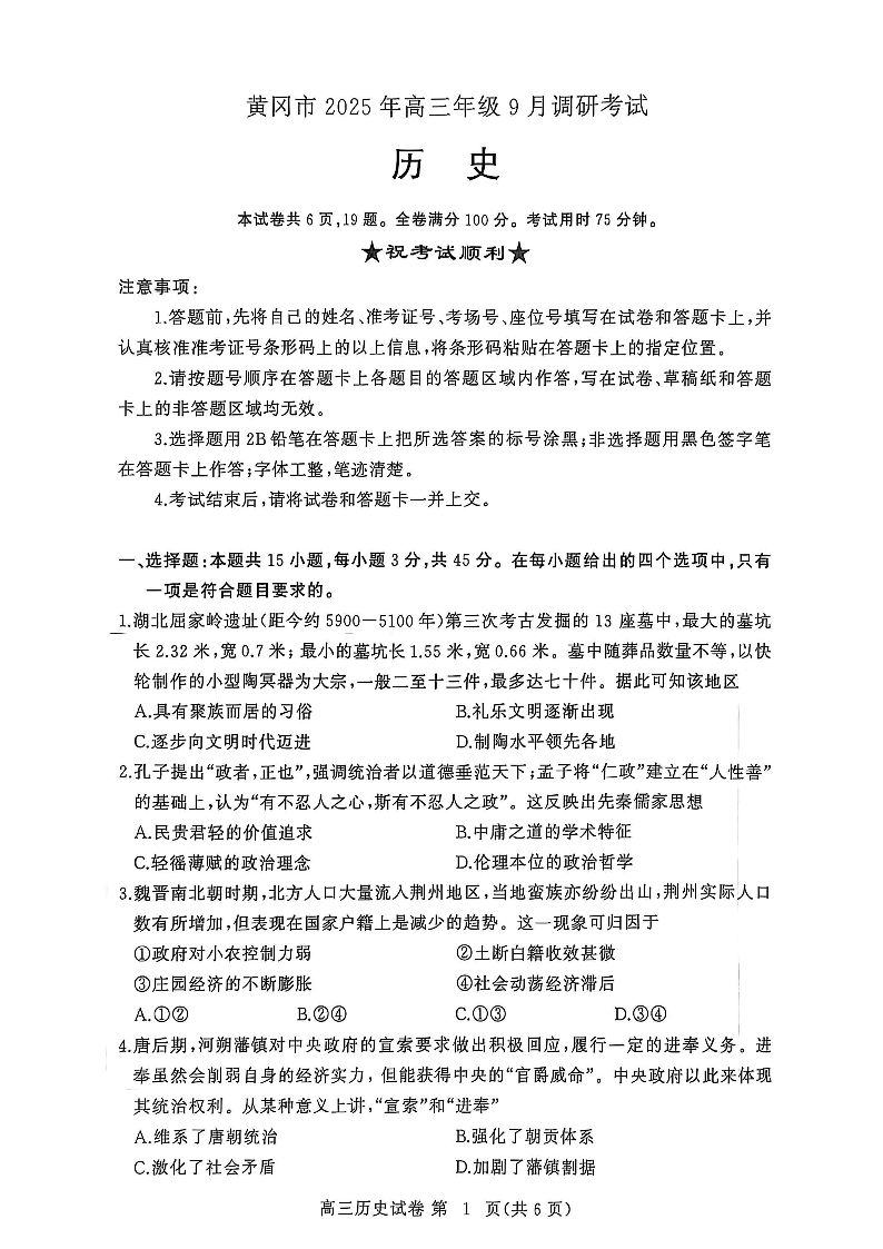 黄冈市2025年高三年级9月调研考试 历史.pdf