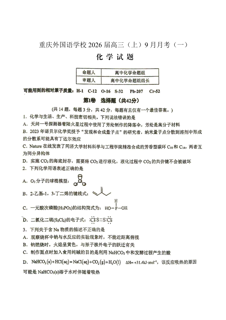重庆外国语学校2026届高三(上)9月月考(一)化学.pdf