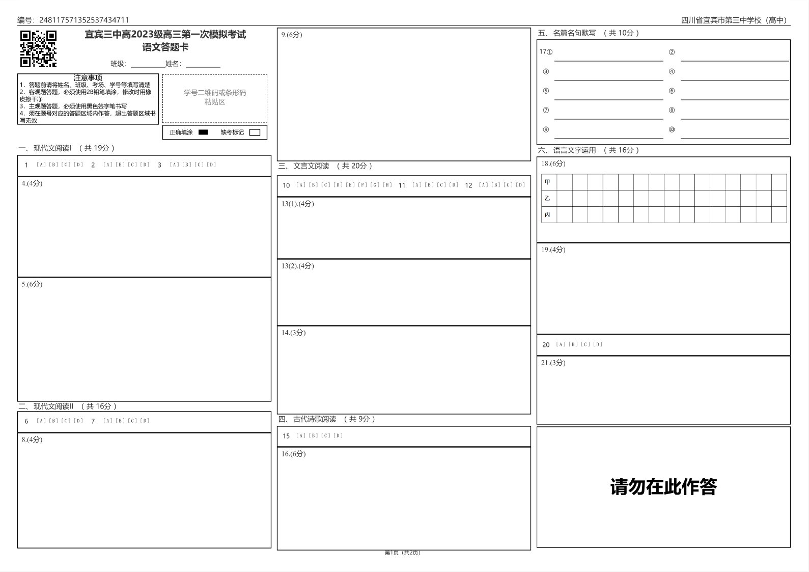 宜宾三中高2023级高三第一次模拟考试语文答题卡.pdf