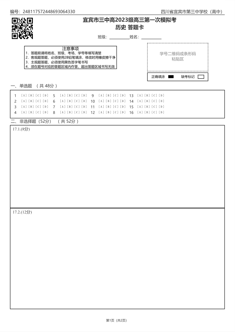 宜宾三中高2023级高三第一次模拟考试历史答题卡.pdf