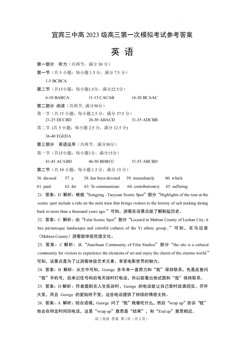 宜宾三中高2023级高三第一次模拟考试 英语答案.docx