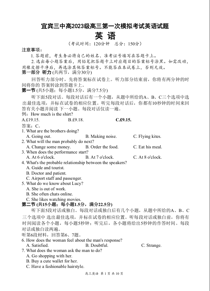 宜宾三中高2023级高三第一次模拟考试 英语.docx