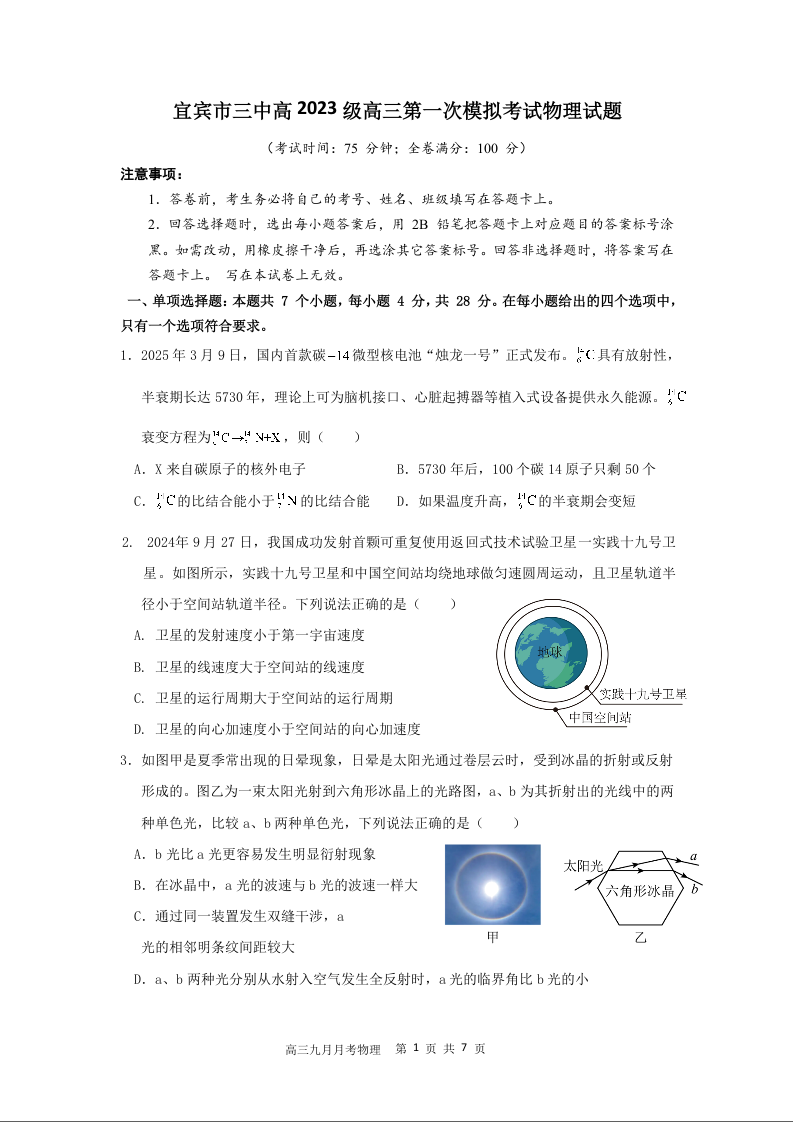 宜宾三中高2023级高三第一次模拟考试 物理.docx
