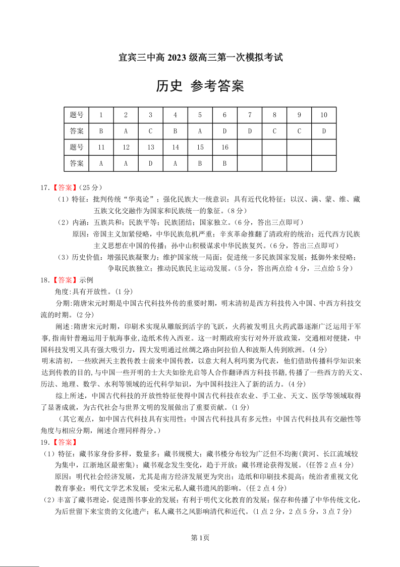 宜宾三中高2023级高三第一次模拟考试 历史答案.docx