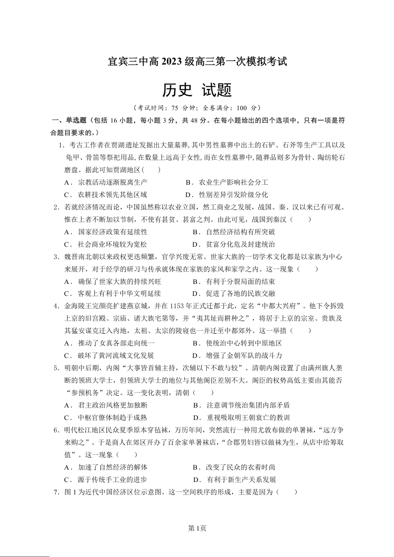 宜宾三中高2023级高三第一次模拟考试 历史.doc