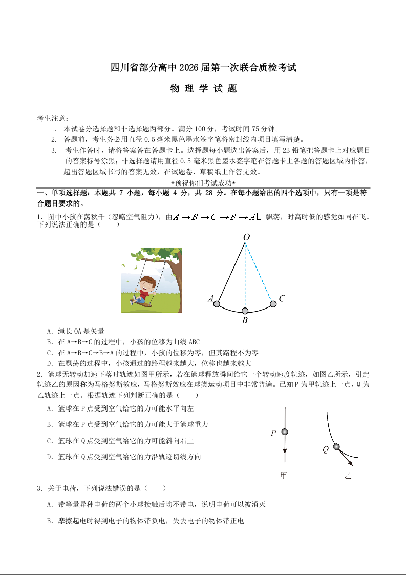 四川省部分高中2026届高三上学期第一次联合质检考试 物理试题(含答案).docx