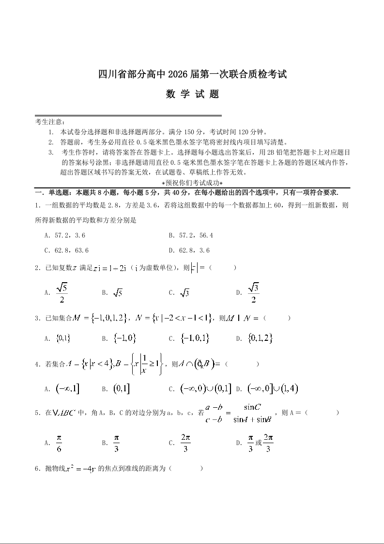四川省部分高中2026届高三上学期第一次联合质检考试 数学试题(含答案).docx