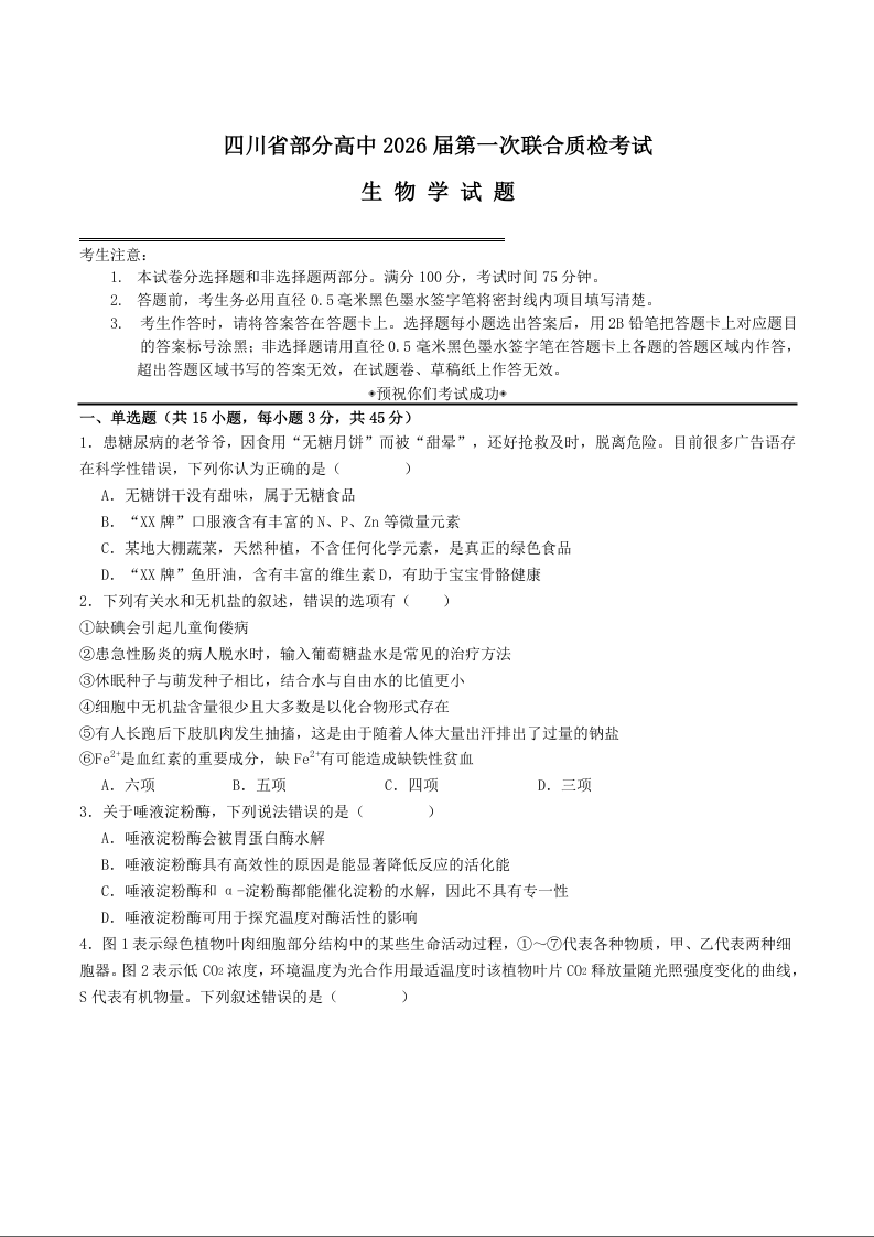 四川省部分高中2026届高三上学期第一次联合质检考试 生物试题(含答案).docx