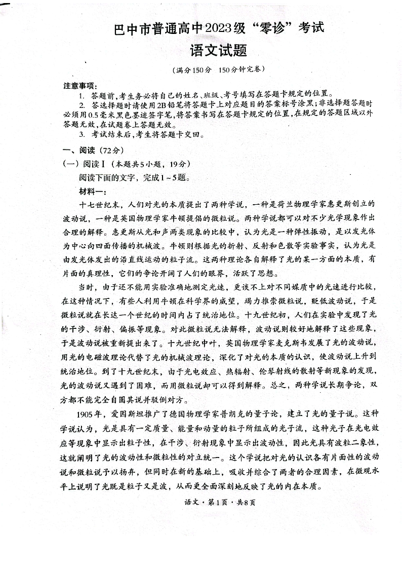 四川省巴中市普通高中2023级“零诊”考试 语文.pdf
