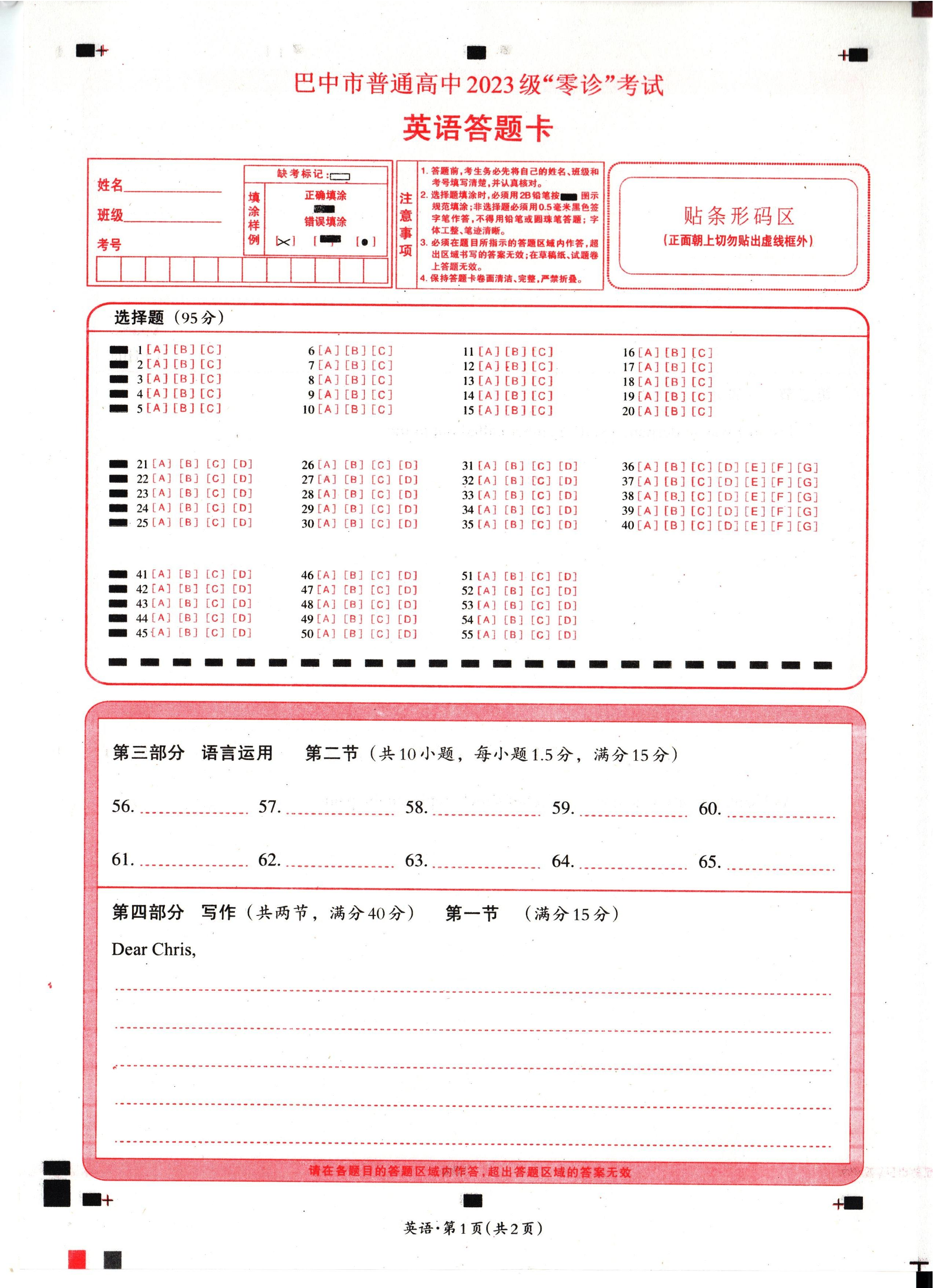 四川省巴中市普通高中2023级“零诊”考试 英语答题卡.pdf