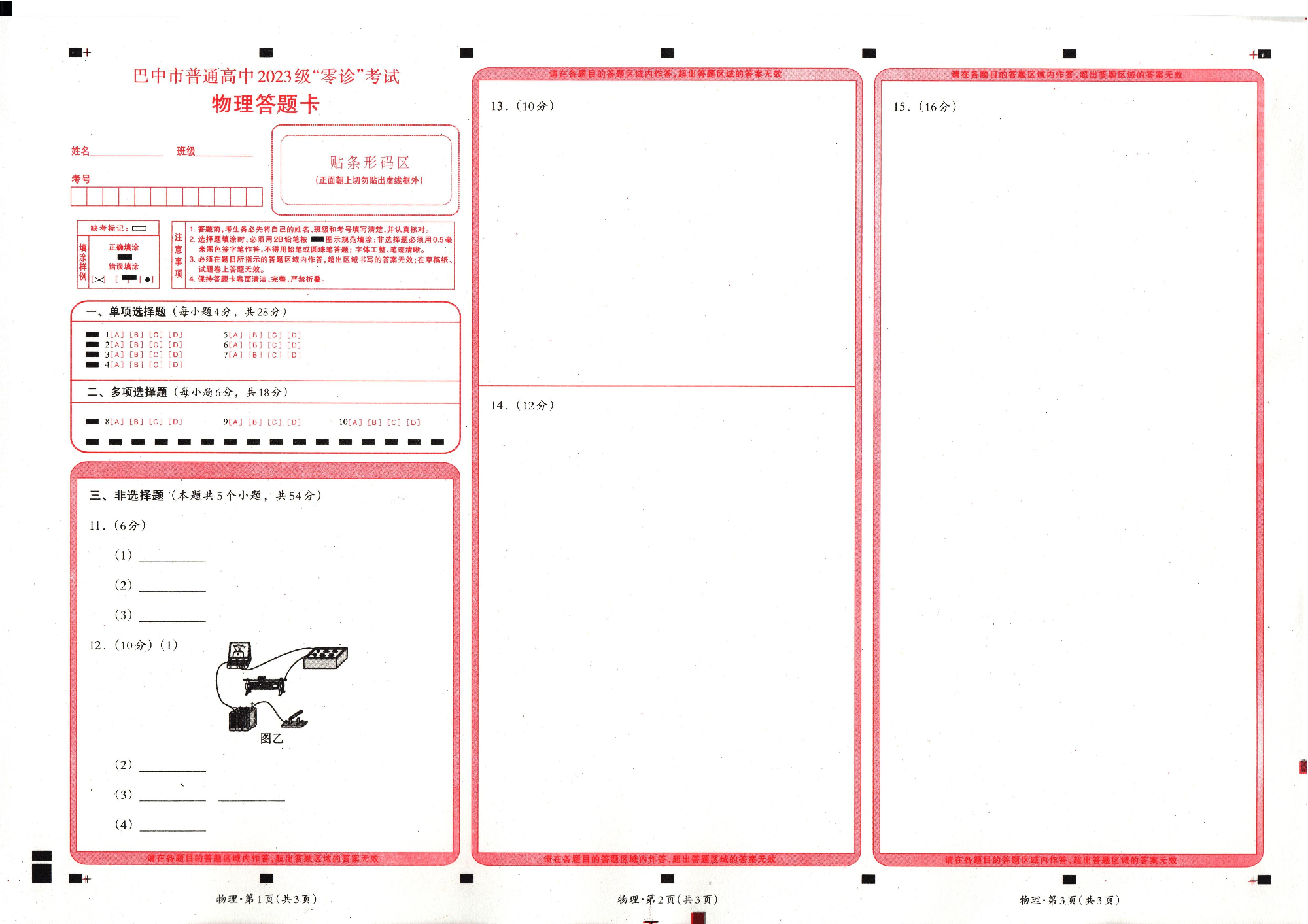 四川省巴中市普通高中2023级“零诊”考试 物理答题卡.pdf