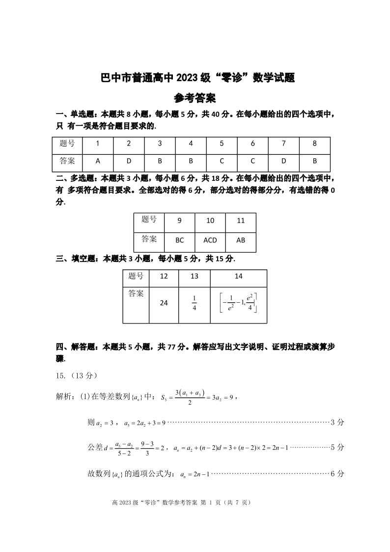 四川省巴中市普通高中2023级“零诊”考试 数学答案.pdf