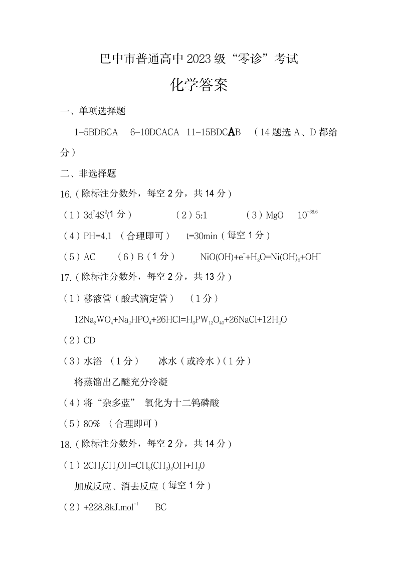 四川省巴中市普通高中2023级“零诊”考试 化学答案.pdf