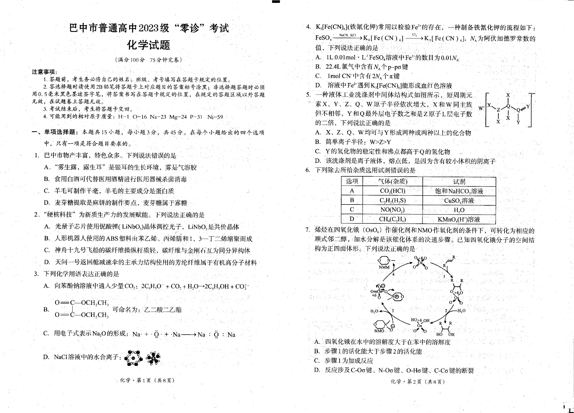 四川省巴中市普通高中2023级“零诊”考试 化学.pdf