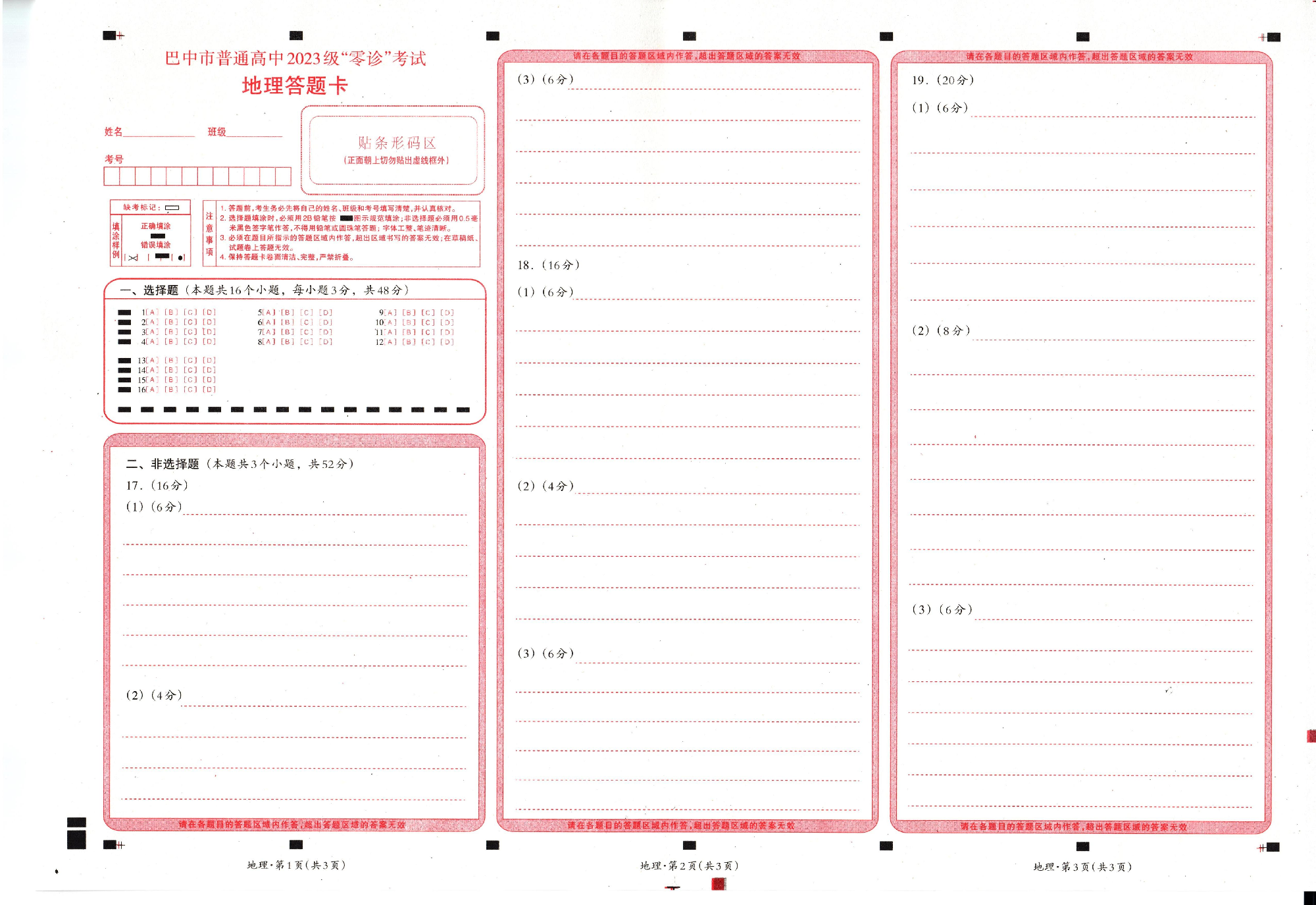 四川省巴中市普通高中2023级“零诊”考试 地理答题卡.pdf