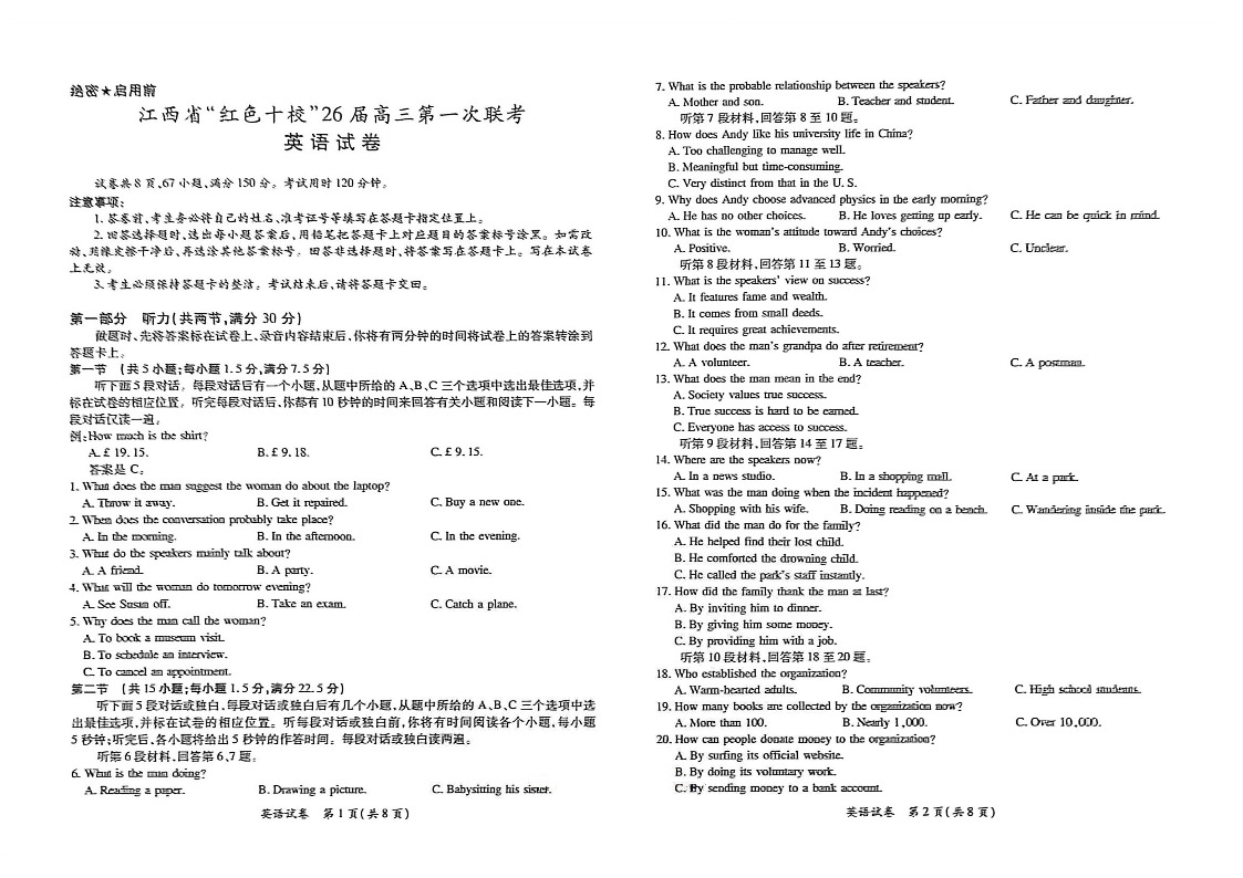 江西省“红色十校”2026届高三第一次联考 英语试卷(含答案).pdf